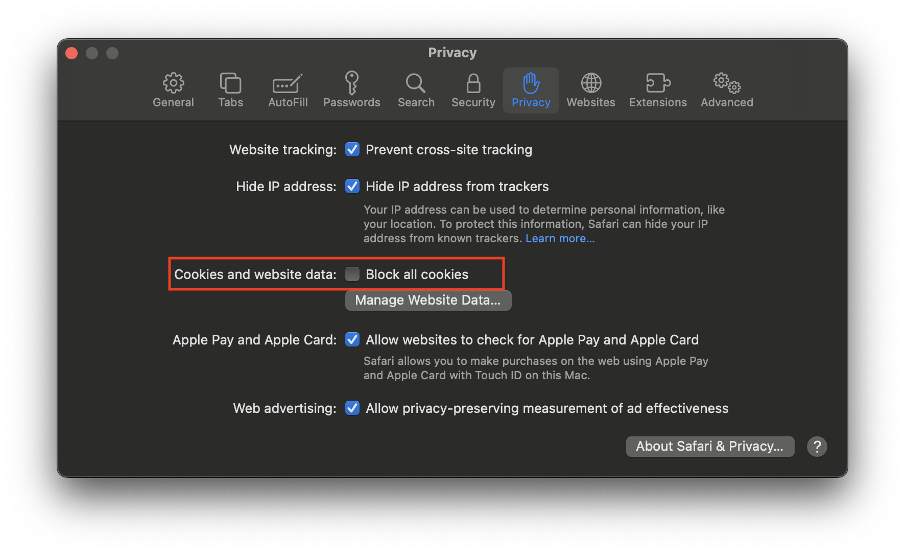 Pilih Menu "Cookies and Other site data"