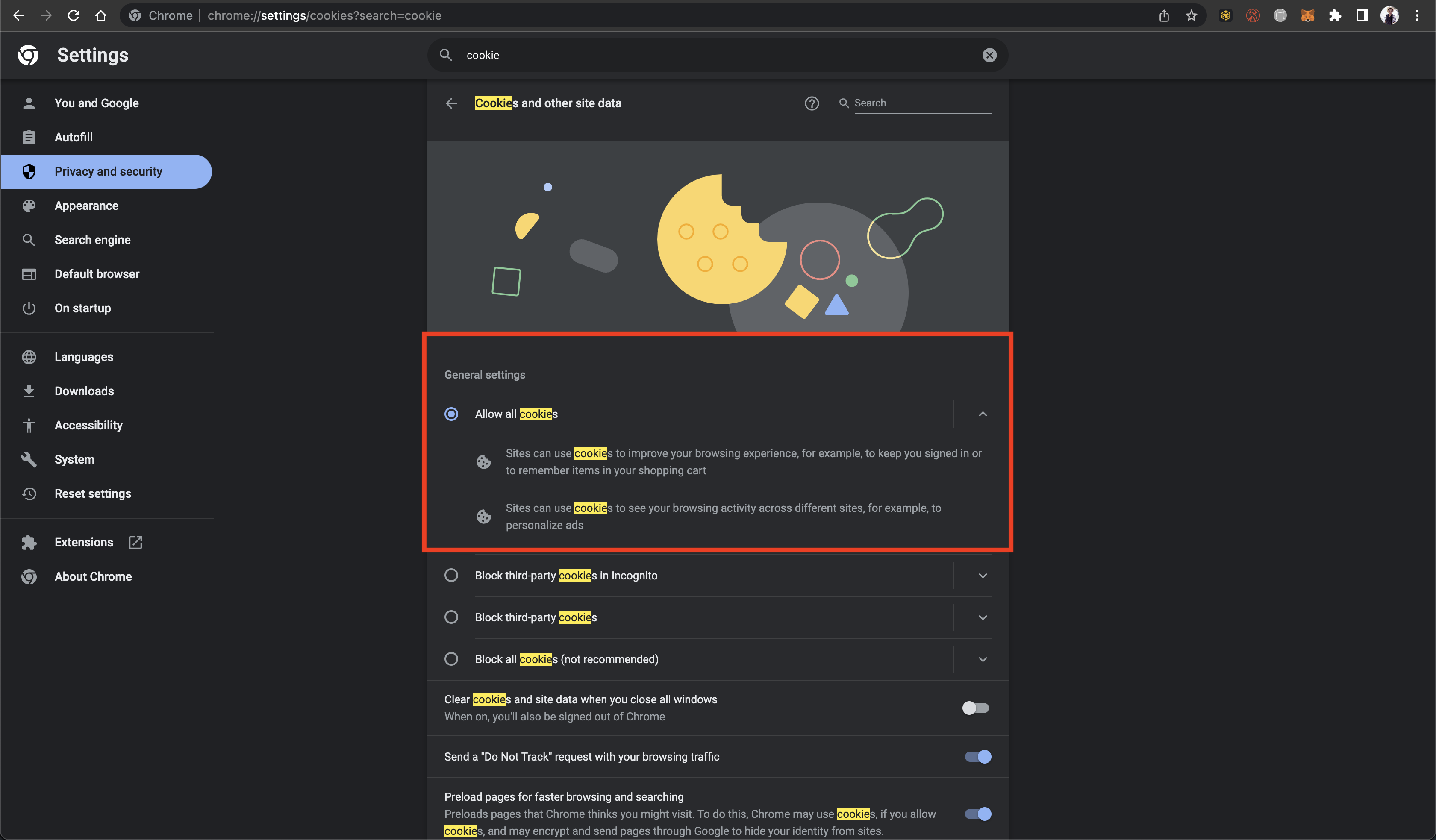 Pastikan pada "General Setings" pilih "Allow all cookies"