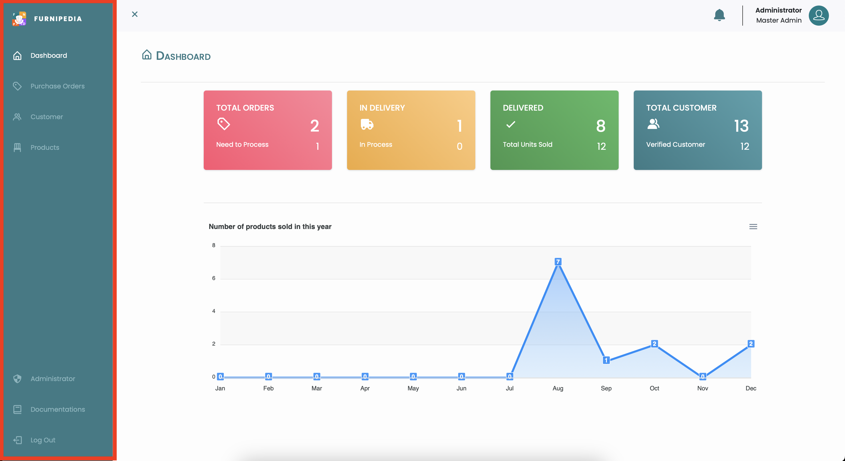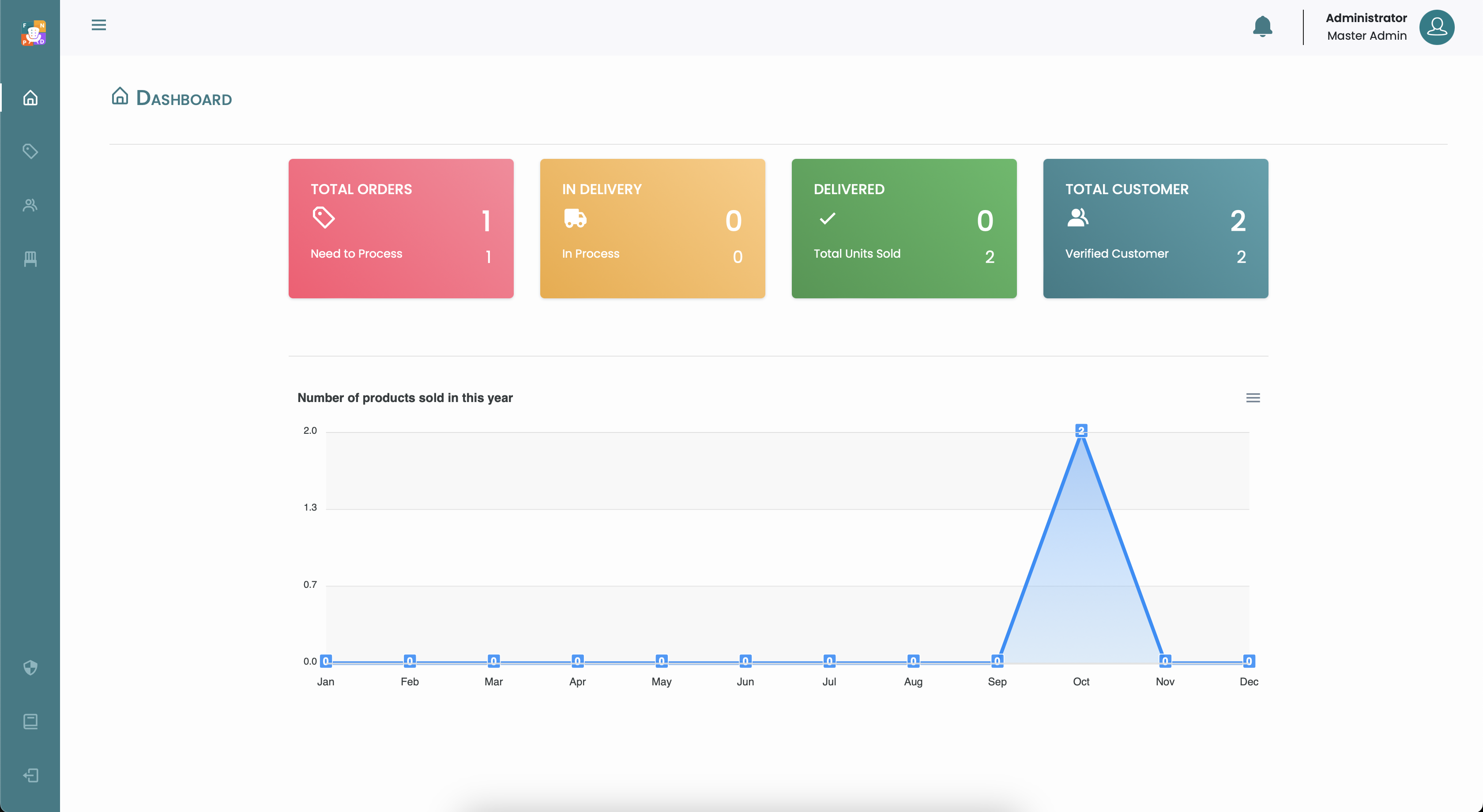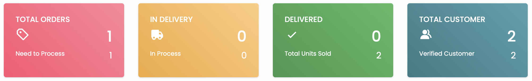 Dashboard adalah halaman pertama dan terdapat informasi terkait jumlah status orderan produk, dan