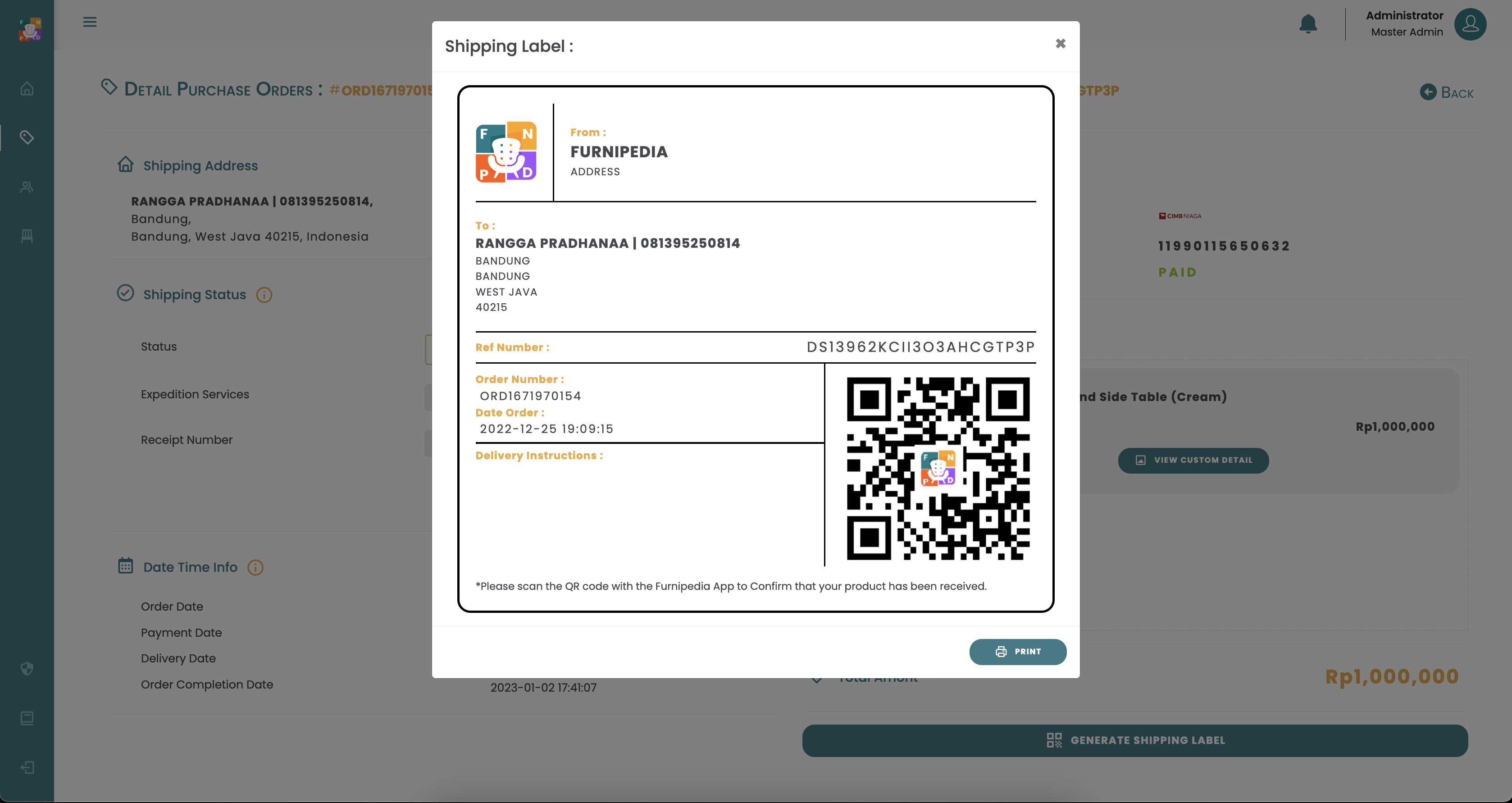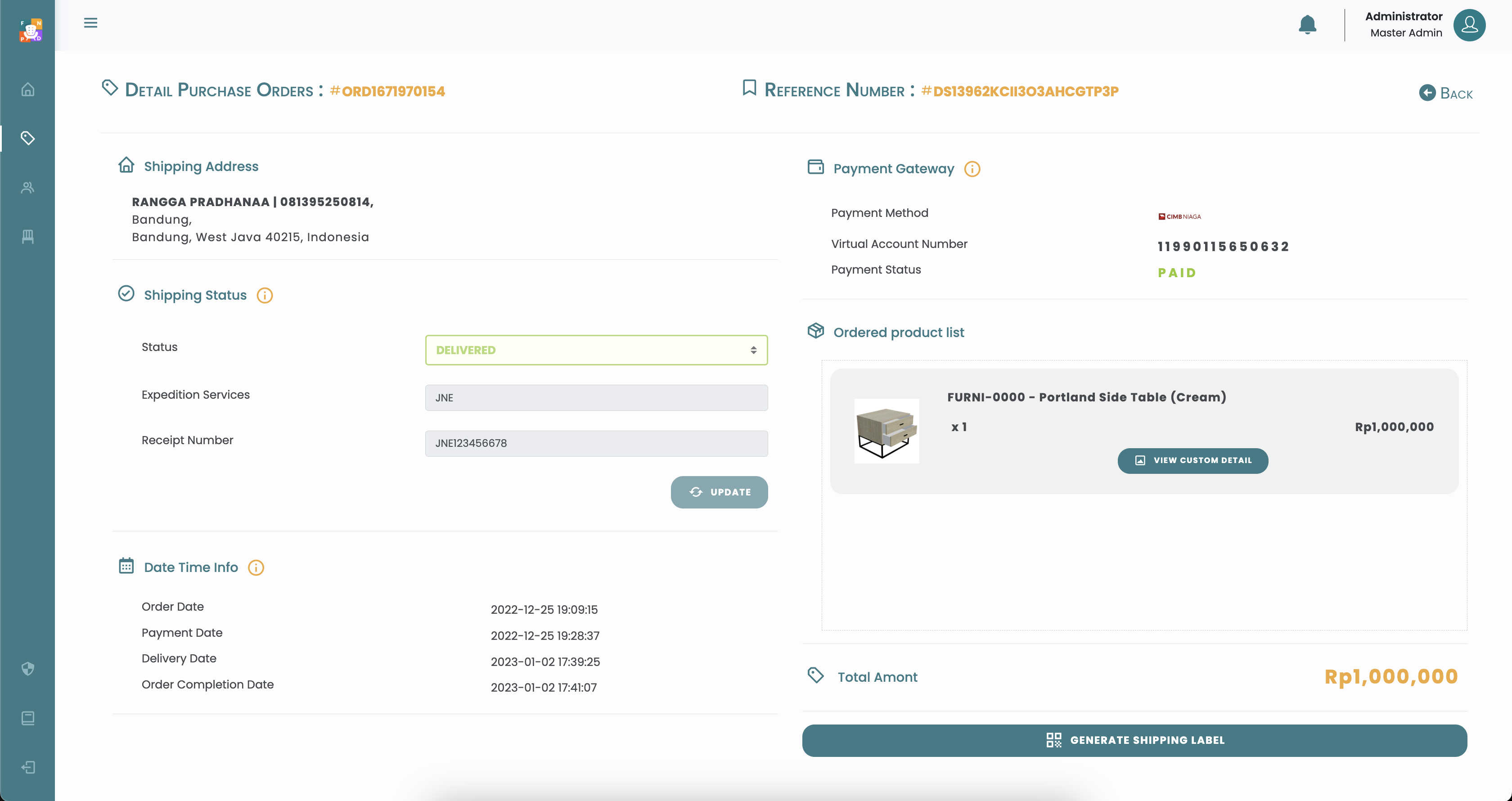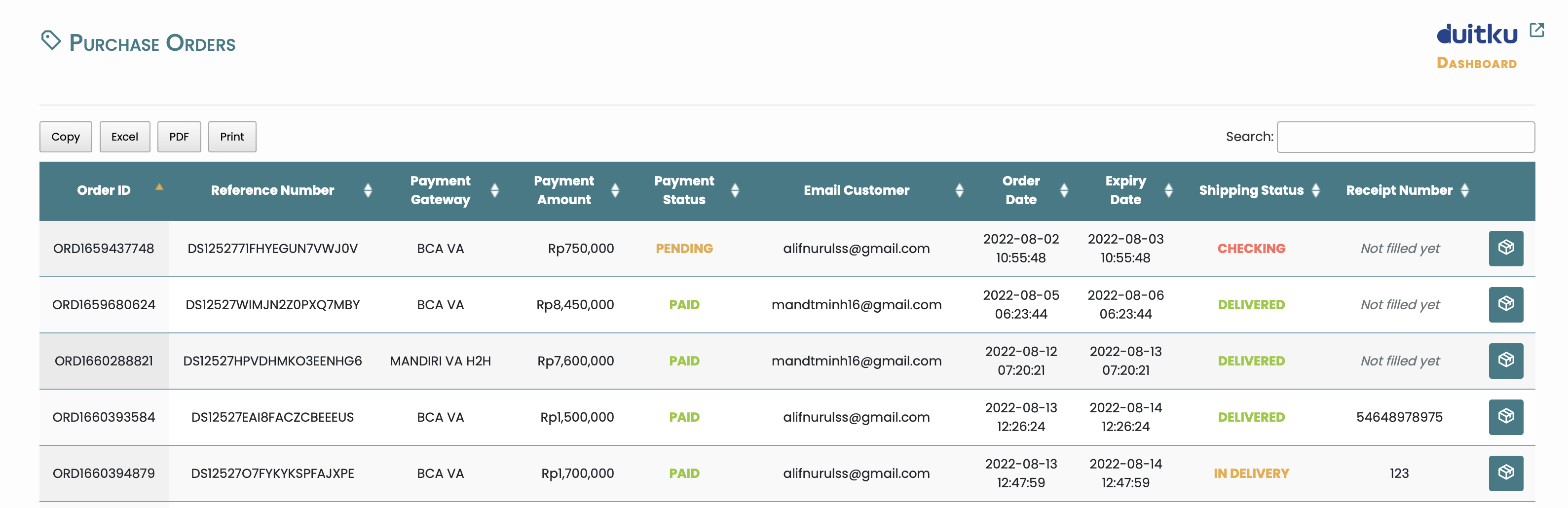 Halaman Purchase Orders menampilkan semua aktifitas transaksi, status penjualan produk dan aksi untuk