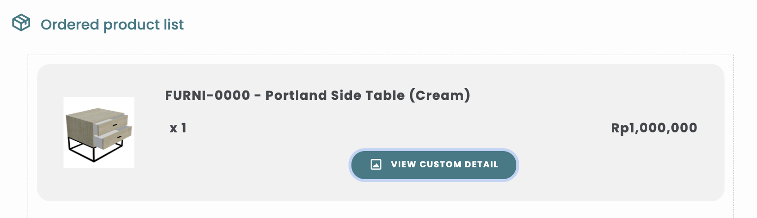 Ini adalah Daftar produk yang di beli, jika terdapat tombol "View Custom Detail" artinya produk yang