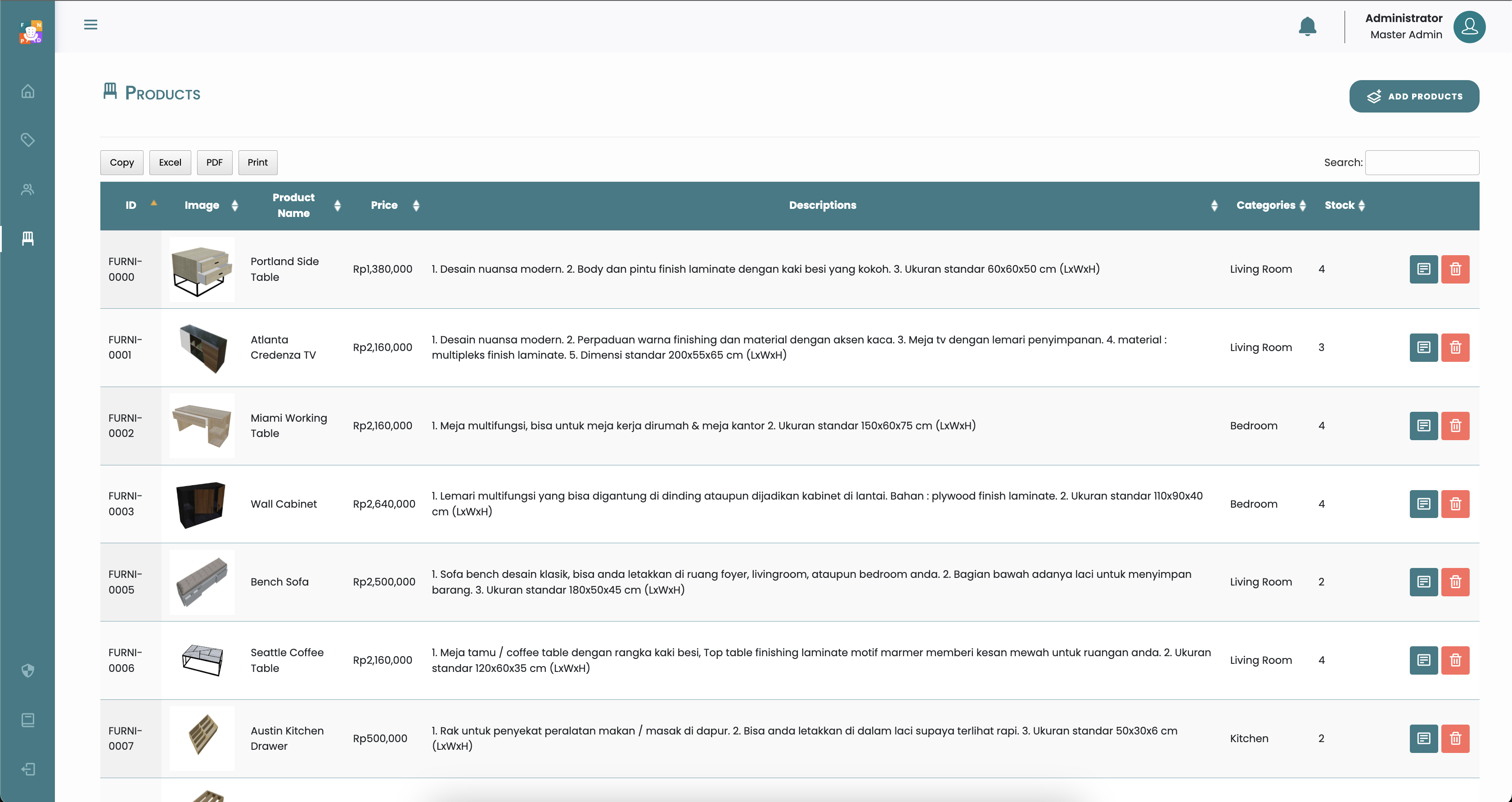 Halaman Products menampilkan List Produk, serta untuk menambahkan dan meengedit informasi detail produk.