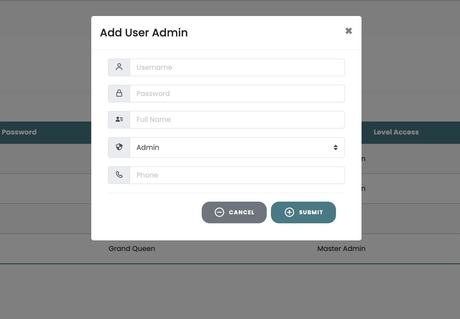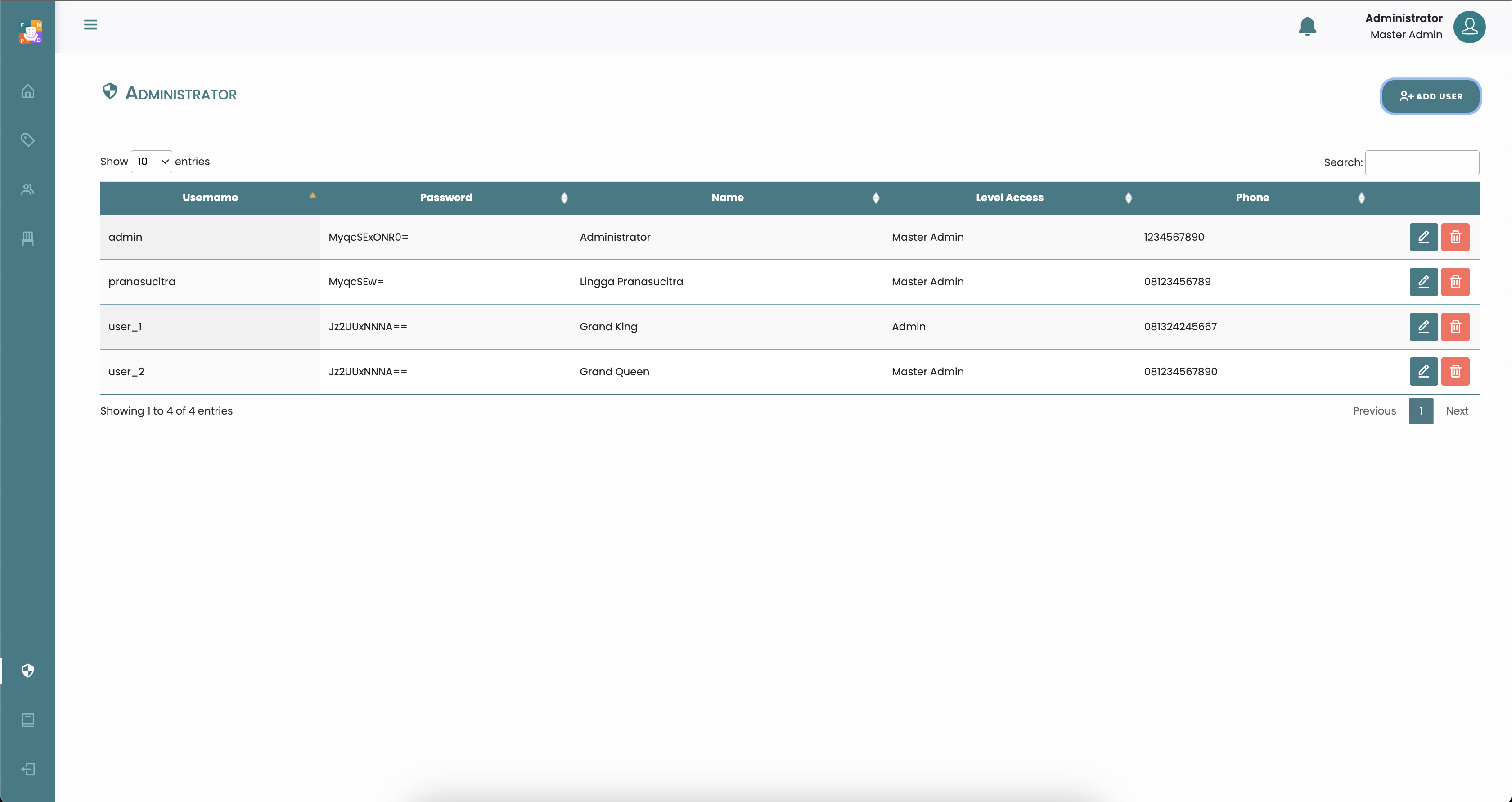 data user, terdapat 2 level akses yaitu "Master Admin" & "Admin", Level "Admin" tidak dapat mengelola